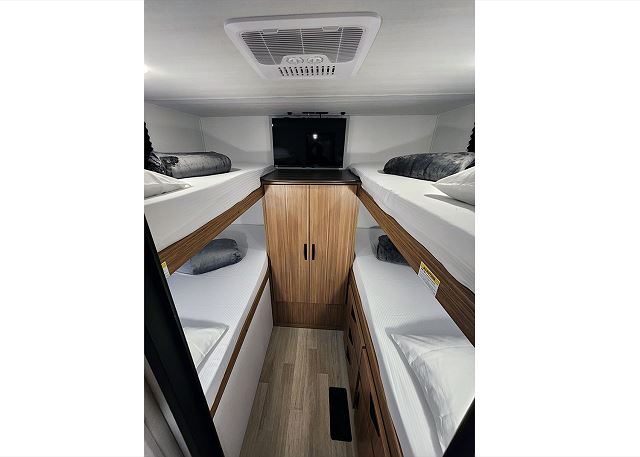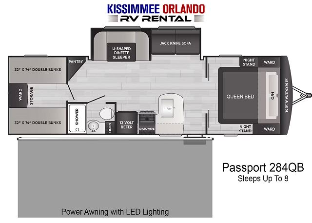 Up front, you’ll find a private queen master bedroom with dual wardrobes and overhead storage. In the rear, the quad bunkhouse offers four separate beds, giving kids and guests their own private retreat. Additional sleeping comes from the convertible sleeper dinette and flip-down sofa, allowing the Passport 284QB to comfortably sleep up to 8 guests.