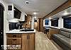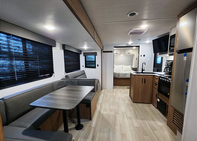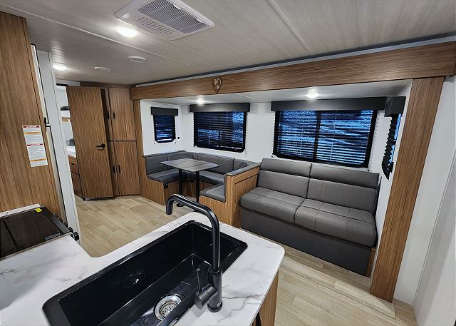The fully equipped kitchen includes a large refrigerator, microwave, oven, cooktop, pantry, and plenty of cabinet space—perfect for preparing meals after a day of park adventures. The open living area features a cozy sofa, booth dinette, and an entertainment center with TV hookup. The full bathroom includes a shower, vanity, and outside entry door for convenient access from the campsite.