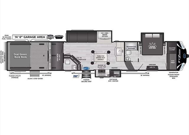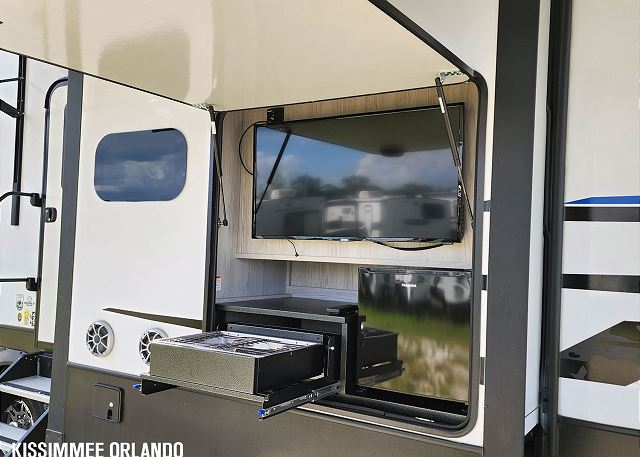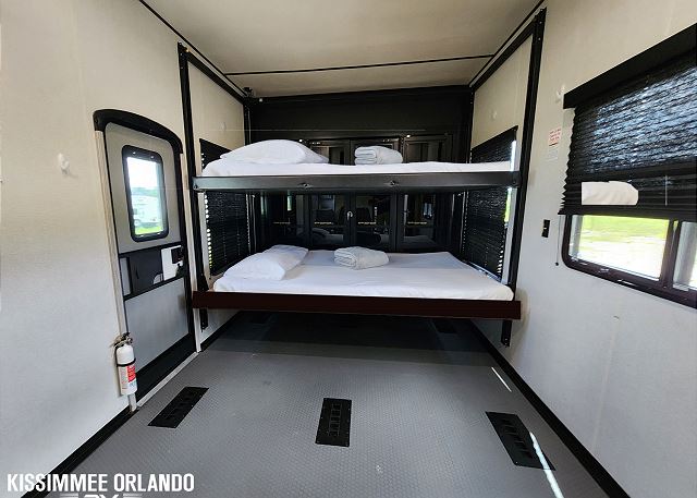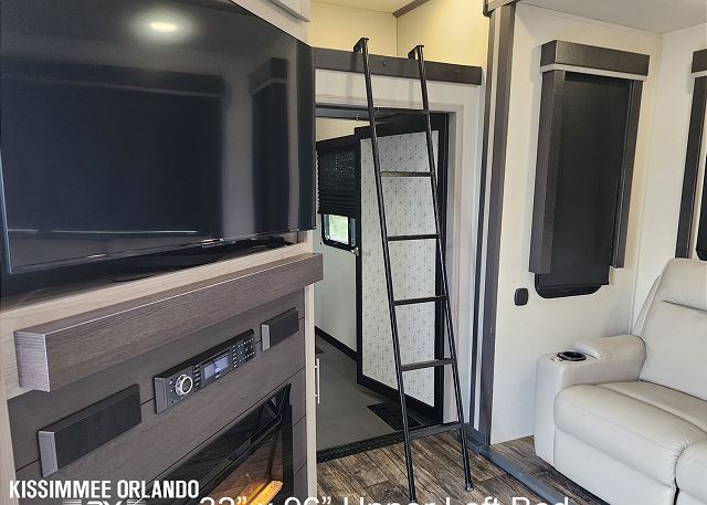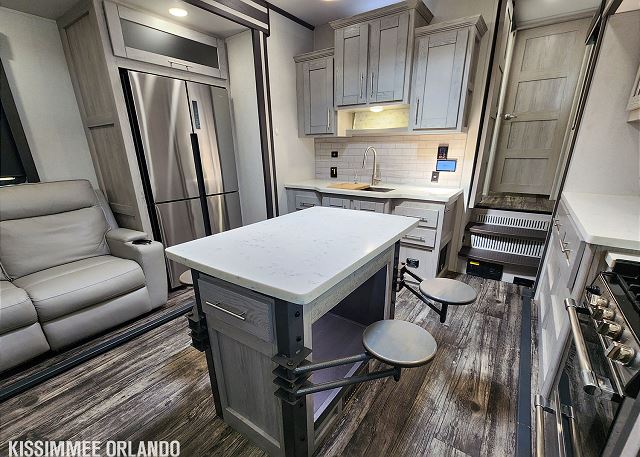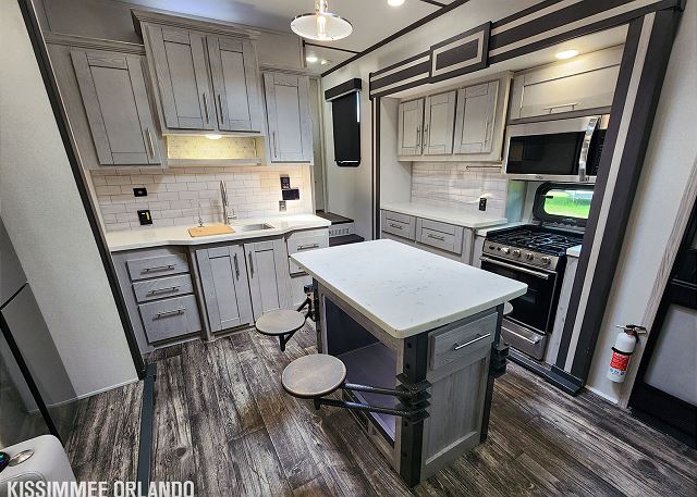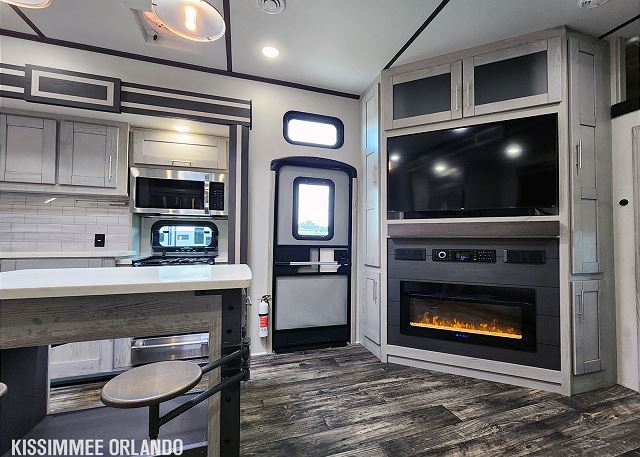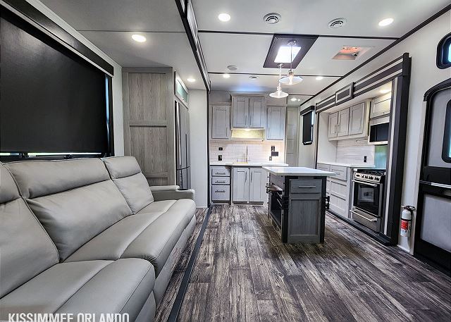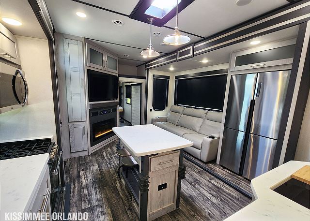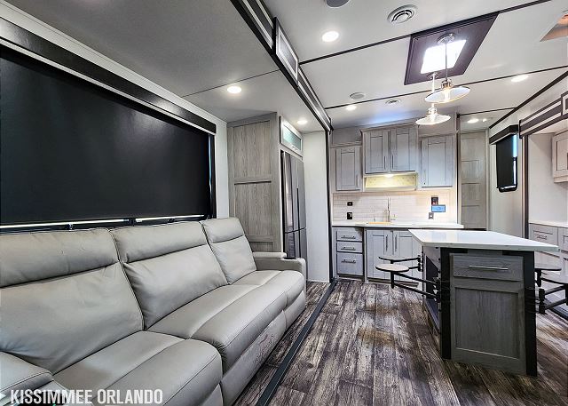 Our 45ft Fuzion 427 is a luxury fifth wheel that combines premium finishes with versatile sleeping arrangements, making it an ideal choice for families and groups. Its floorplan includes a private king bedroom up front, a rear Flex Room with 2 queen beds, and a loft bunk for extra guests. With space for up to 7 people and a bath and a half, it’s designed to provide comfort, privacy, and convenience during every trip. The main living area is spacious and inviting, with theater recliners, a large HDTV, an electric fireplace, and a fully equipped kitchen featuring solid-surface countertops, residential refrigerator, microwave, oven, and pantry storage. The Flex Room’s separate entry and adjacent half bath make it a great setup for kids, teens, or extra guests. With its thoughtful layout and premium features, the Fuzion 427 makes extended stays or family adventures both stylish and stress-free. Your fully outfitted rental comes with everything you need for a relaxing time: pillows and bedding for all sleeping areas, premium towels, paper products, pots and pans, flatware and cutlery sets, coffee maker, toaster, blender, rice cooker/veggie steamer, broom and dustpan, cleaning supplies, garbage bags, and much more. Let us handle delivery, setup, and takedown—all you have to do is show up and enjoy. Reserve your Fuzion 427 today! AMENITIES 45’ Length, Sleeps up to 7 Pet-Free / Allergen Free Three Slide-Outs Three Air Conditioners 2 Private Bedrooms King Master Bedroom w/ TV Spacious Walk-In Shower Flex-Room w/ TV & Half Bath Twin Loft Sleep Area Spacious, Open Living Area Sofa with Recliners Kitchen Island with Pull-Out Stools Large, Fully Equipped Kitchen Large 21CF Refrigerator Dual Entries 50" HD LED TV Large Electric Fireplace BlueRay / DVD Player Dual Power Awnings w/ LEDs Outside Kitchen Outside TV Interior/exterior speakers In-Command Smart RV System Outdoor Chairs, Plus Much More! Only Kissimmee Orlando RV Rental offers an assortment of accessories to enhance your RV vacation experience and make life easy. From 4-passenger golf carts* to portable cribs, these popular add-on items are available for any of our rentals. You will be provided a complete accessory list with your reservation confirmation .A Few Of Our Available Accessories For Your Outdoor Adventure: Adult & Children's Bicycles* | Outdoor Screened Tent | Outdoor Pop-Up Tent | Large Coolers | Fire Pit* | Hammocks | 6’ Folding Table | Portable Crib | Pack n’ Play | Outdoor Games | Camping Accessories | RV Exterior Water Filter | Outdoor Screened Tent | and more! * These Rental Items are not permitted to be offered by 3rd party vendors at Walt Disney World's Fort Wilderness Campground