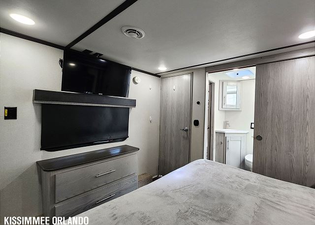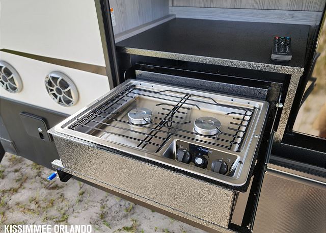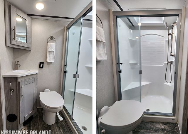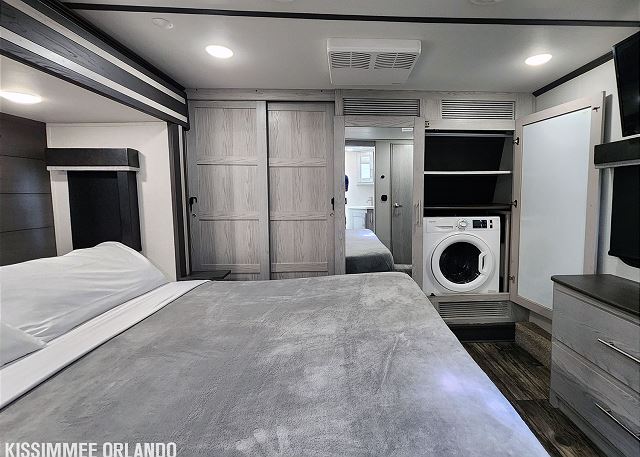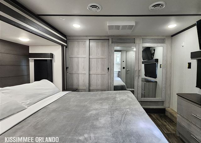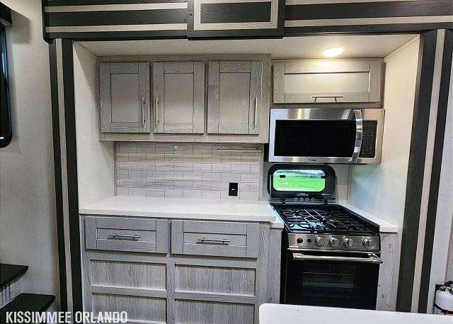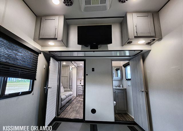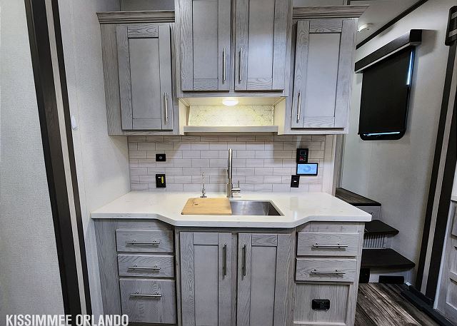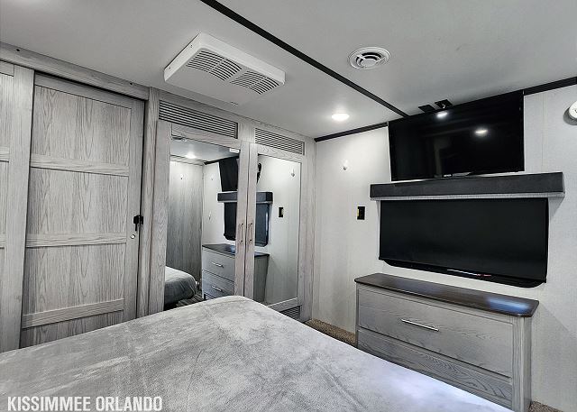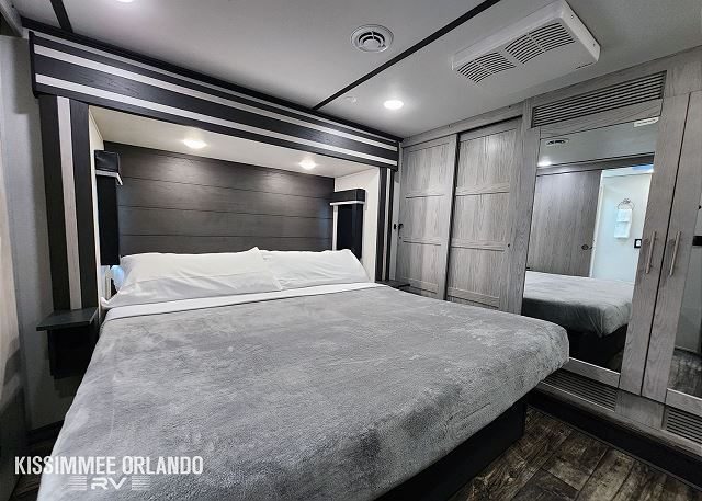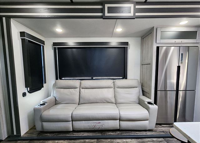 Our 45ft Fuzion 427 is a luxury fifth wheel that combines premium finishes with versatile sleeping arrangements, making it an ideal choice for families and groups. Its floorplan includes a private king bedroom up front, a rear Flex Room with 2 queen beds, and a loft bunk for extra guests. With space for up to 7 people and a bath and a half, it’s designed to provide comfort, privacy, and convenience during every trip. The main living area is spacious and inviting, with theater recliners, a large HDTV, an electric fireplace, and a fully equipped kitchen featuring solid-surface countertops, residential refrigerator, microwave, oven, and pantry storage. The Flex Room’s separate entry and adjacent half bath make it a great setup for kids, teens, or extra guests. With its thoughtful layout and premium features, the Fuzion 427 makes extended stays or family adventures both stylish and stress-free. Your fully outfitted rental comes with everything you need for a relaxing time: pillows and bedding for all sleeping areas, premium towels, paper products, pots and pans, flatware and cutlery sets, coffee maker, toaster, blender, rice cooker/veggie steamer, broom and dustpan, cleaning supplies, garbage bags, and much more. Let us handle delivery, setup, and takedown—all you have to do is show up and enjoy. Reserve your Fuzion 427 today! AMENITIES 45’ Length, Sleeps up to 7 Pet-Free / Allergen Free Three Slide-Outs Three Air Conditioners 2 Private Bedrooms King Master Bedroom w/ TV Spacious Walk-In Shower Flex-Room w/ TV & Half Bath Twin Loft Sleep Area Spacious, Open Living Area Sofa with Recliners Kitchen Island with Pull-Out Stools Large, Fully Equipped Kitchen Large 21CF Refrigerator Dual Entries 50" HD LED TV Large Electric Fireplace BlueRay / DVD Player Dual Power Awnings w/ LEDs Outside Kitchen Outside TV Interior/exterior speakers In-Command Smart RV System Outdoor Chairs, Plus Much More! Only Kissimmee Orlando RV Rental offers an assortment of accessories to enhance your RV vacation experience and make life easy. From 4-passenger golf carts* to portable cribs, these popular add-on items are available for any of our rentals. You will be provided a complete accessory list with your reservation confirmation .A Few Of Our Available Accessories For Your Outdoor Adventure: Adult & Children's Bicycles* | Outdoor Screened Tent | Outdoor Pop-Up Tent | Large Coolers | Fire Pit* | Hammocks | 6’ Folding Table | Portable Crib | Pack n’ Play | Outdoor Games | Camping Accessories | RV Exterior Water Filter | Outdoor Screened Tent | and more! * These Rental Items are not permitted to be offered by 3rd party vendors at Walt Disney World's Fort Wilderness Campground