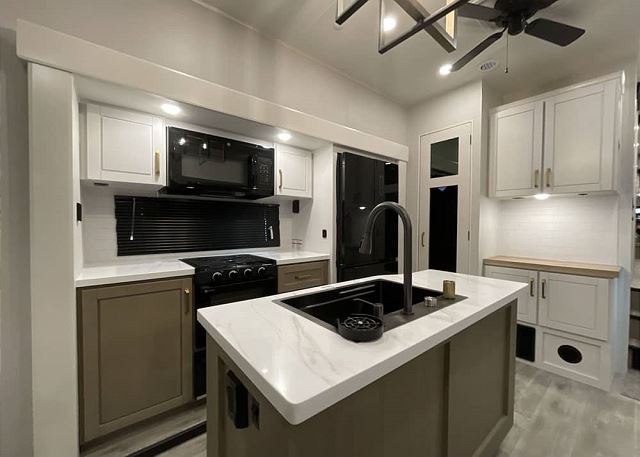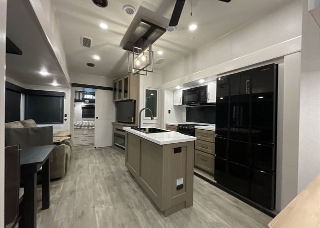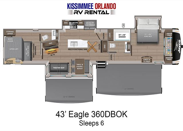 Our 43ft Jayco Eagle 360DBOK Fifth Wheel checks off all the boxes for those looking for a true camping haven. This beautiful and amenity-laden fifth wheel features a spacious & beautiful open living area with dinette, theater seating, entertainment center with 50ā TV, and large electric fireplace. The Eagle 360DBOK also offers up a beautiful gourmet kitchen with a large residential style refrigerator, large pantry and island with farmhouse style sink. Sleep areas include king bedroom with large bathroom up front, second private queen bedroom with half-bath in the rear, and upper queen size loft sleep area above the rear bedroom An outdoor TV as well as dual power awnings complete your outdoor living experience. Our Eagle 360DBOK has it all and more!