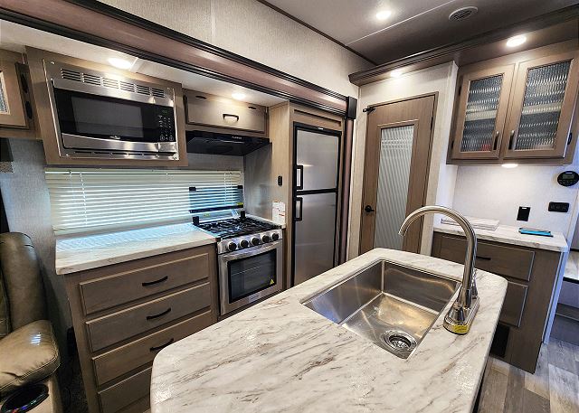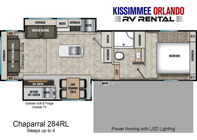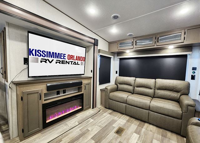 You'll will appreciate the full bathroom with a large walk-in shower and vanity, as well as the power awning with LED lighting for relaxing evenings outdoors. Whether you're booking a Fort Wilderness getaway or a retreat at another central Florida destination, this fifth wheel offers everything you need to feel right at home.