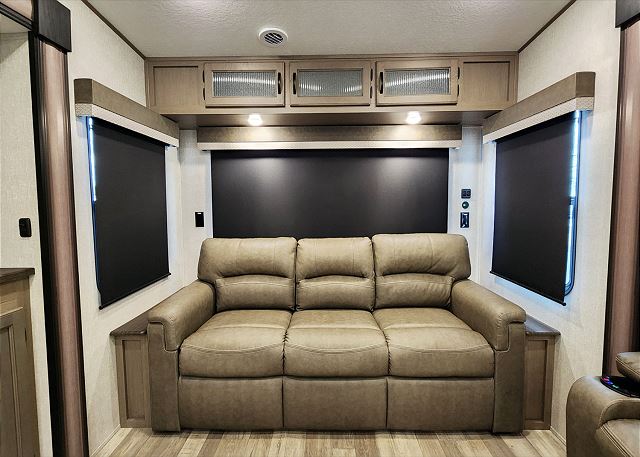 Enjoy the perfect blend of comfort, style, and livability in the Chaparral 284RL fifth wheel. This beautifully maintained unit features a spacious rear living layout with theater-style recliners, a sleeper sofa, and large picture windows that fill the camper with natural light. The private queen bedroom offers a cozy retreat, while the roomy kitchen with island includes a residential refrigerator, oven, microwave, and everything you need to prepare meals during your stay.