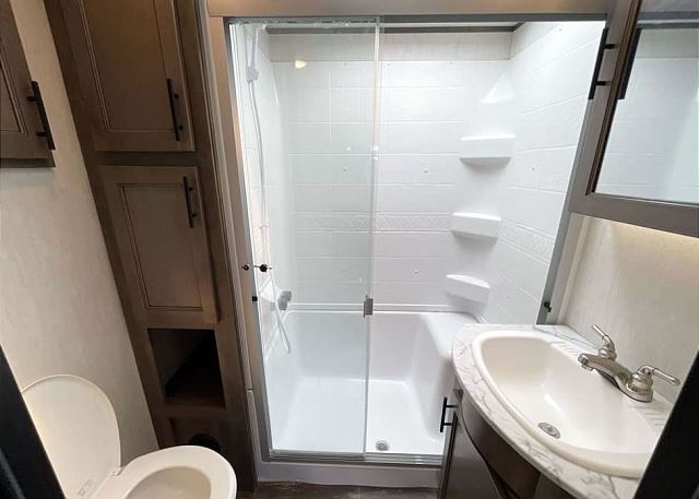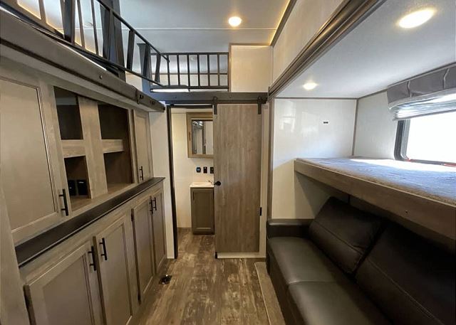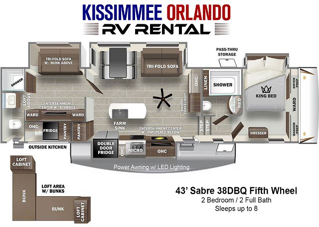 Our Sabre 38DBQ is a spacious two-bedroom, two-bath fifth wheel that’s great for larger families or groups who want comfort and privacy while enjoying their Central Florida vacation. This well-laid-out floorplan includes a private front king bedroom with full bathroom access and wardrobe storage, as well as a rear bedroom with 3 bunk beds and a full sleeper sofa, plus its own full second bathroom. The central living area offers another sofa sleeper a freestanding dinette, an electric fireplace, a large TV, and a fully equipped kitchen with residential refrigerator, microwave, oven, and pantry space—perfect for longer stays or guests who prefer to cook during their visit.
