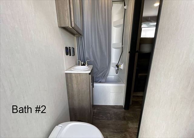 The unit comes fully stocked with linens, towels, kitchenware, dishes, cleaning supplies, outdoor chairs, and everything you need for a turnkey stay. Outside, you'll enjoy the large power awning with LED lighting, outdoor kitchen, and exterior access to the second bathroom—great for kids or guests coming in from the parks or campground. Delivery, leveling, and full setup is included at Fort Wilderness or your chosen location. Whether you're traveling with friends or extended family, the Sabre 38DBQ offers multiple living zones and plenty of space for everyone to spread out and relax.