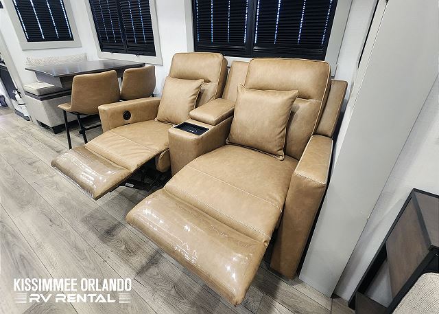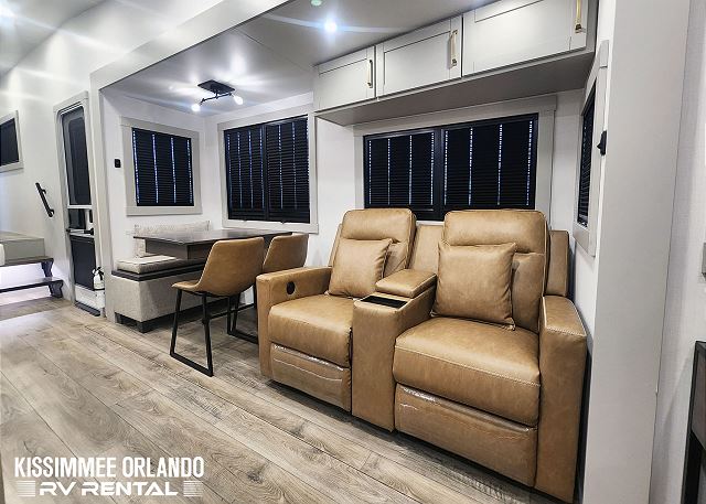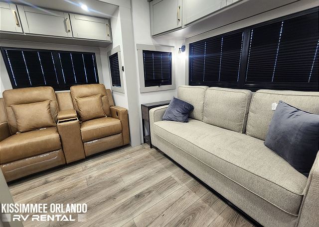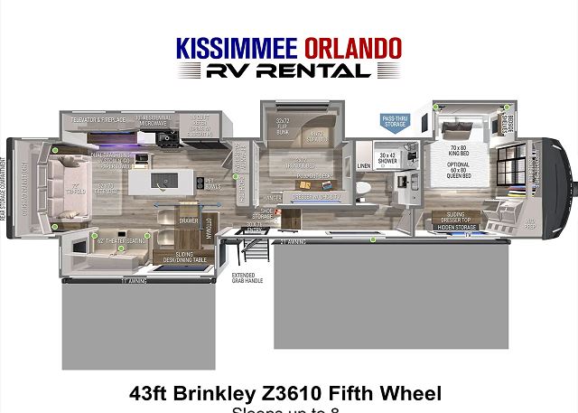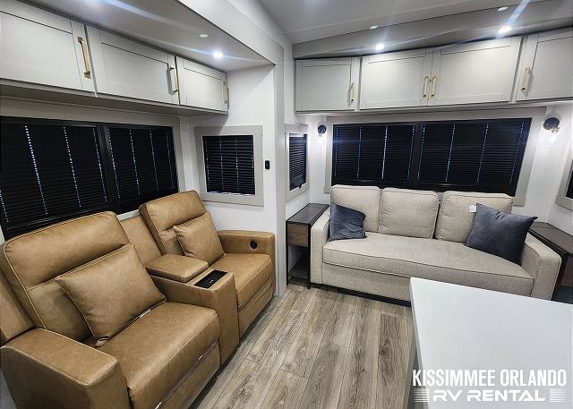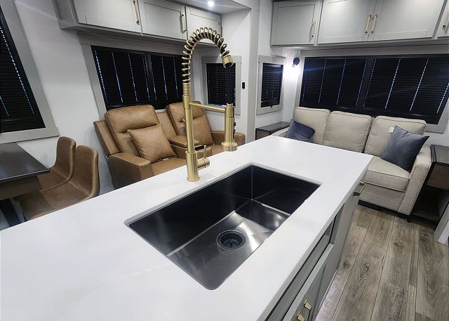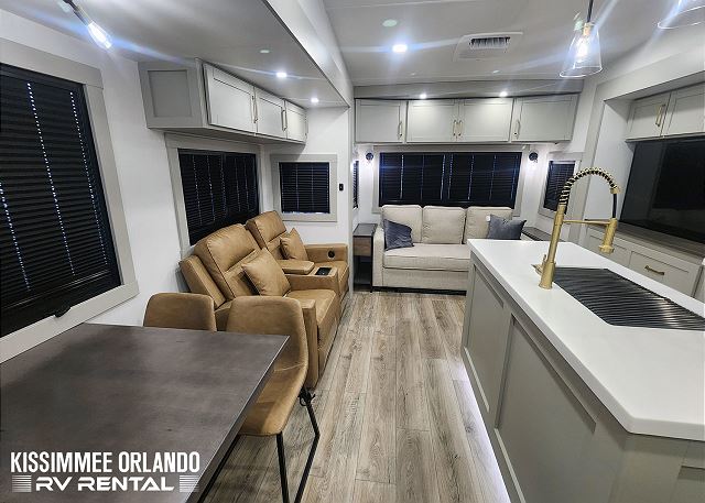 Sleeping arrangements are equally indulgent, with a king-sized main bedroom with a generously sized bathroom up front, and a centrally located den/bedroom offering flexible sleeping options including an upper twin bunk, a full/queen fold-out sofa sleeper, and an additional pull-out twin bed below. Outdoors, spacious dual power awnings, convenient outside mini-fridge, and outside TV will ensure that every moment spent under the open sky is nothing short of unforgettable. And with our fully-outfitted RV rental, you'll find everything you need for a relaxing getaway, from premium bedding and towels to a comprehensive selection of kitchen essentials and cleaning supplies. Simply reserve your Brinkley Z3612 Fifth Wheel today, and let us handle the rest - delivering, setting up, and ensuring that all you have to do is arrive, unwind, and enjoy the adventure that awaits.