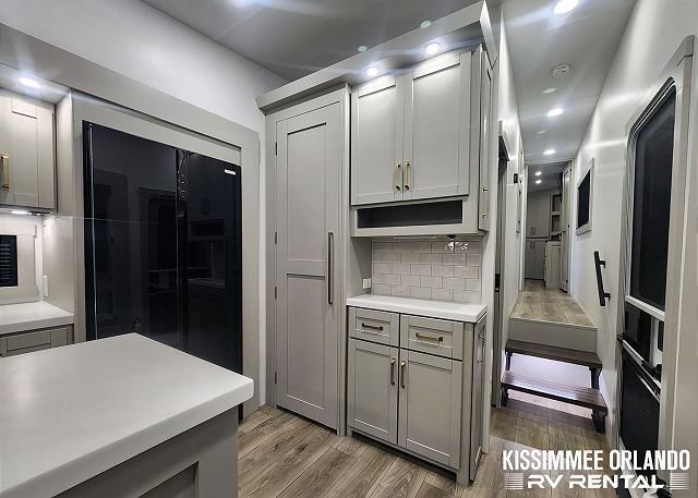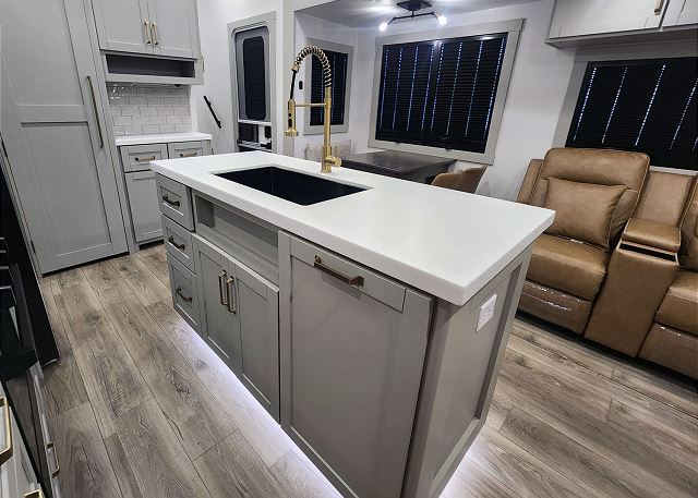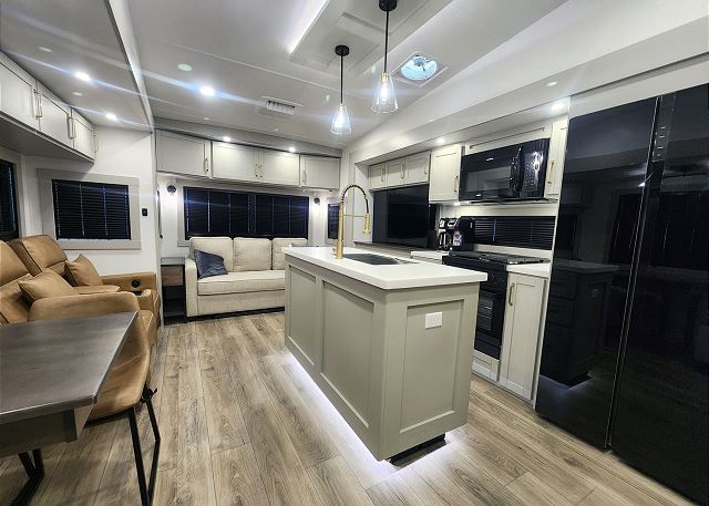 Introducing the remarkable Brinkley Z3612 fifth wheel - a pinnacle of luxury and functionality that elevates every camping adventure to unprecedented levels of comfort and style. From its captivating exterior to its meticulously crafted interior, this Brinkley masterpiece seamlessly combines elegance with practicality. Inside, a spacious open living area beckons with plush theater seating, a sumptuous sleeper sofa, HD TV, and an inviting electric fireplace, providing the perfect retreat after a day of outdoor exploration. The fully-equipped kitchen is a culinary haven, boasting a large residential refrigerator, ample pantry space, and a stylish island featuring a farmhouse-style stainless sink.