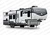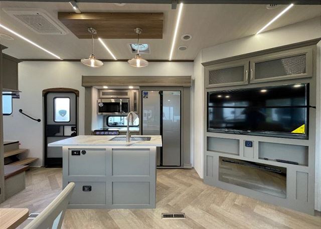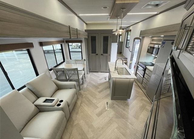 Our Sprinter 3810QBS is a spacious and versatile fifth wheel perfect for families and groups who want comfort, privacy, and multiple living zones during their stay. This floorplan features a private front king bedroom with a full bathroom, along with a large rear bunk room that includes four full size beds and its own half bath, making it ideal for kids or additional guests. The central living area offers theater seating, a freestanding dinette, fireplace, and a large TV, creating a comfortable space to unwind after a day of adventure. The fully equipped kitchen includes a residential refrigerator, oven, microwave, and generous pantry storage for longer stays. Outside, guests can enjoy the power awning with LED lighting and mini-fridge for relaxing evenings.