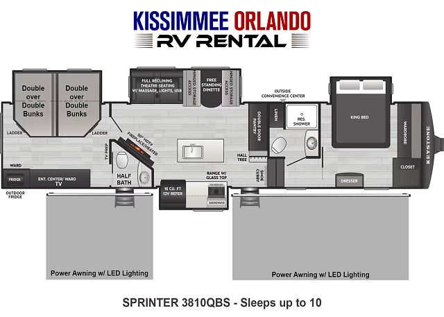 This unit is delivered and fully set up at Fort Wilderness or your selected Central Florida campground. It comes fully stocked with linens, towels, cookware, dishes, utensils, cleaning supplies, and outdoor chairs. With its bath-and-a-half layout, private bunk room, and spacious design, the Sprinter 3810QBS offers an amazing setup for families looking to enjoy a seamless camping experience.